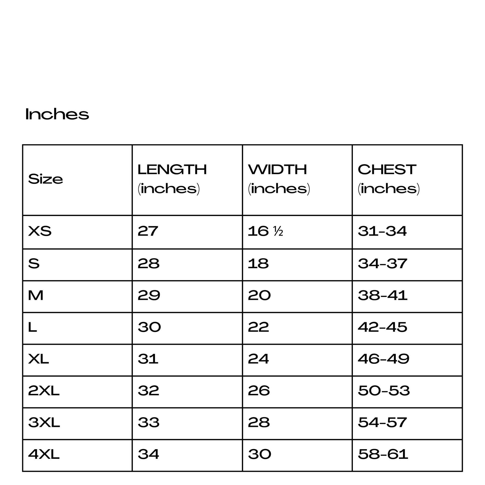 LENGTH (inches) | WIDTH (inches) | CHEST (inches) | |